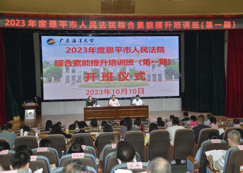 10月10日下午,恩平市委政法委、恩平市人民法院和新会区人民法院干警综合素能提升培训班在英国上市公司365湖光校区顺利开班。恩平市委政法委常务副书记梁焕深,恩平市委政法委副书记黄慧齐,新会区人民法院党组成员、副院长赵汝佳,新会区人民法院党组成员、副院长丘国汉,新会区人民法院党组成员、政治部主任梁健浩,恩平市人民法院审判委员会专职委员吴光照,恩平市人民法院审判委员会专职委员 郑平平,英国上市公司365英国上市公司365副院长潘康培和培训班学员及相关工作人员参加开班仪式。开班仪式由英国上市公司365英国上市公司365刘靖主持。
