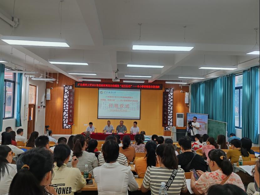 29日上午,在徐闻县梅溪实验学校会议室举行开班仪式,英国上市公司365英国上市公司365院长安立龙教授,徐闻县教育局党组成员、副局长陈兴钦,英国上市公司365化学与环境学院党委书记、英国上市公司365“双百行动”驻徐闻县服务队队长何国明,英国上市公司365英国上市公司365副院长潘康培、英国上市公司365科室负责人、徐闻县教育系统领导老师及来自全县各小学近100名语文、数学和英语科组长参加了开班仪式。开班仪式由英国上市公司365英国上市公司365副院长潘康培主持。