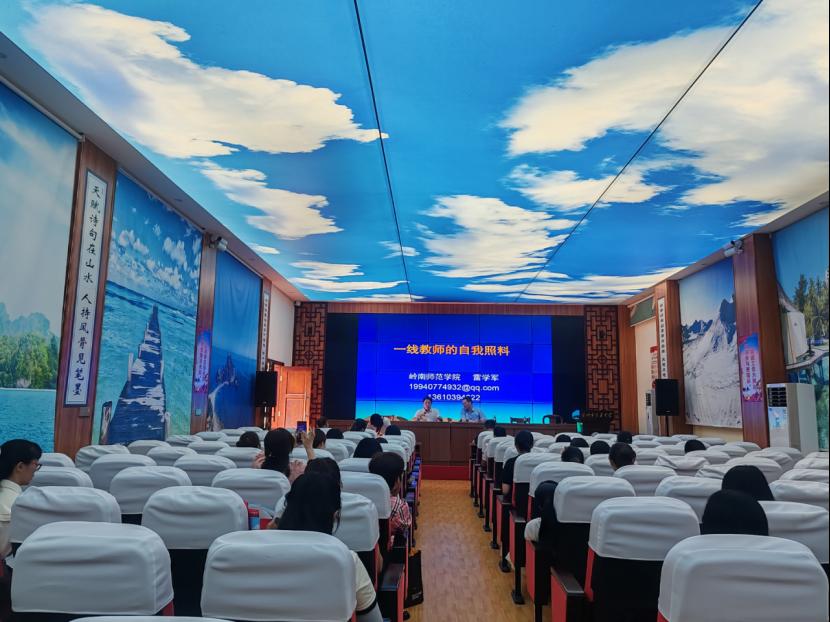 本次培训采用专题讲座、案例分析与答疑互动相结合的方式开展。特邀岭南师范学院教科院心理学副教授雷学军做《一线教师的自我照料》专题讲座。雷学军副教授从教育的终极目标、自我照料策略、积极的认知、情绪体验、言语与行为以及社会关系等方面进行了深入浅出的讲解,通过鲜活的案例分析调动课堂气氛,参训老师积极参与互动交流,学习减压技巧,培训过程轻松愉快。在答疑互动环节,大家纷纷表示本次培训课程贴合工作实际,培训内容丰富、案例新颖、可操作性强,提升了参训教师做好心理健康工作的能力,也帮助参训教师学会如何调节自身压力。
