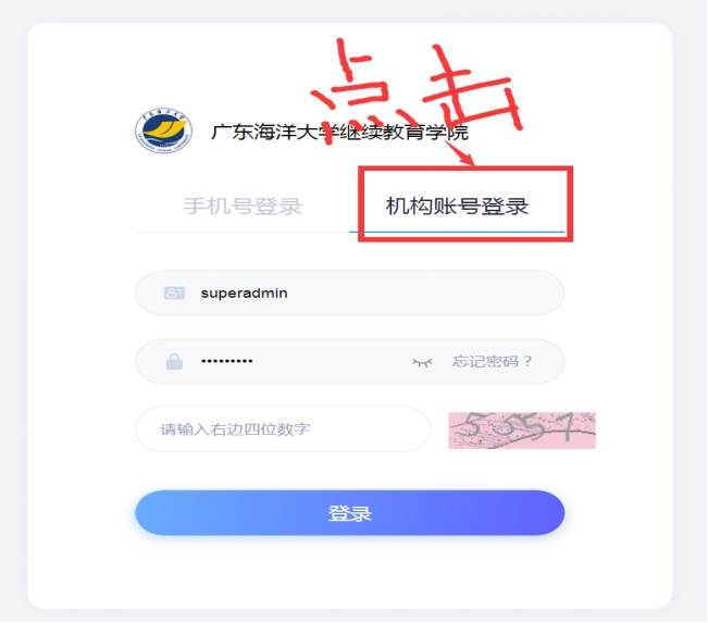 1.新生必须在班主任或教务员的指导下,登录综合教务管理系统(http://gdhydx.jxjy.chaoxing.com/login),首次登录需选择机构账号登录页面进行登录(操作图示后附),账号为学号(学校统一编发,开学时由班主任或教务员通知到学生),密码为身份证号后六位,学号由学校继续教育综合教务管理系统(统一)生成,由班主任或教务员下发。学生首次登录综合教务管理系统,需完善并核对个人信息,如有错误,应立即报给班主任或教务员上报学院进行修改。新生登录综合教务管理系统,进入首页可查看个人学籍资料、课程安排、提交各类申请以及查阅学校、学院通知公告等。